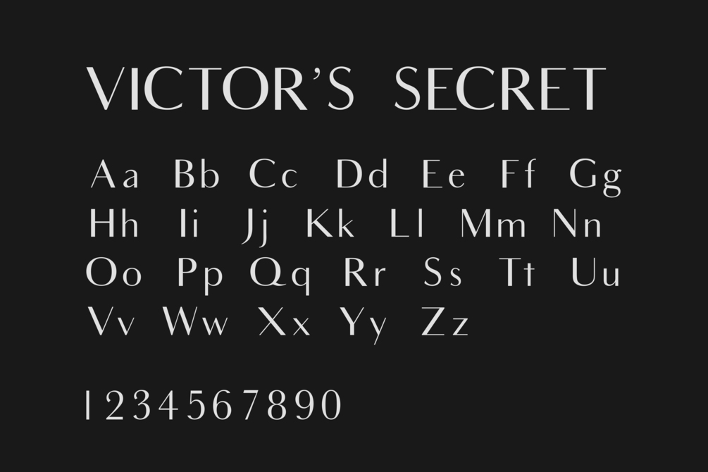 Victor's Secret is a San-Serif font that comes in upper and lower case. It also has most punctuation and numerals. It was inspired by modern fonts that are used in fashion but most of these fonts are serifs. Victor's Secret is a San-Serif that still has that modernist feel.